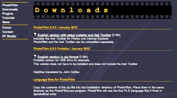 Il primo passo che devi compiere prima di imparare come modificare le foto al PC è collegarti al sito Internet di PhotoFiltre e cliccare prima sulla voce Downloads che si trova nella barra laterale di sinistra e poi sul collegamento English version in zip format per scaricare la versione del programma che non richiede installazioni sul tuo PC (quella con l'installazione integra una barra degli strumenti aggiuntiva per il browser). A scaricamento ultimato apri, facendo doppio click su di esso, l'archivio appena scaricato (es. PhotoFiltre-en-653.zip) ed estraine il contenuto in una cartella qualsiasi.