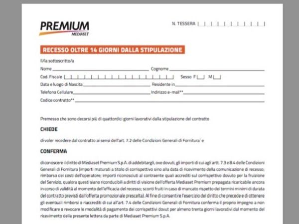 Dopo aver scaricato il modulo, stampalo, compilalo in ogni sua parte e invialo tramite raccomanda A/R all'indirizzo Mediaset Premium S.p.A. Casella Postale 101, 20900 Monza (MB) allegando una copia del documento d'identità.