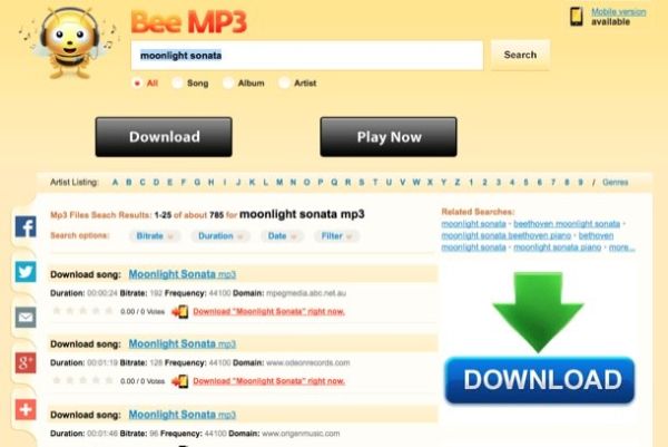 Un altro sito sul quale puoi trovare musica gratis MP3 è Bee MP3 che però, a differenza di quelli visti in precedenza, non raccoglie opere di artisti indipendenti utilizzabili liberamente in altri progetti. Si tratta bensì di un motore di ricerca generico che permette di trovare qualsiasi tipo di brano in formato MP3 disponibile sul Web.