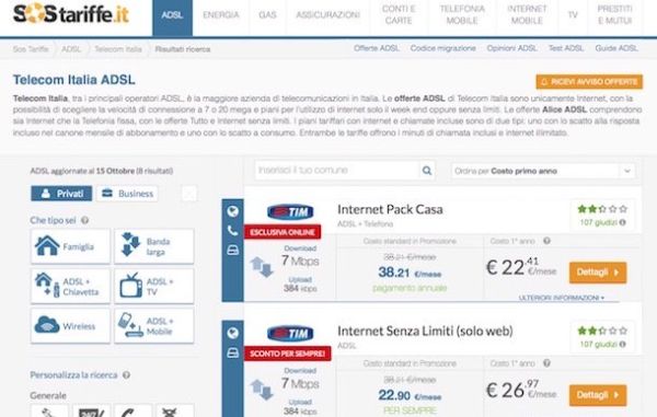 Se non riesci a raccapezzarti fra le tante offerte TIM disponibili attualmente, puoi collegarti al sito Internet SOS Tariffe e confrontare le varie promozioni proposte dall'operatore scoprendo qual è quella più adatta alle tue esigenze. Non devi far altro che utilizzare le icone collocate nella barra laterale di sinistra (sotto la dicitura Personalizza la ricerca) e indicare le caratteristiche che deve avere il piano ADSL che vorresti sottoscrivere.