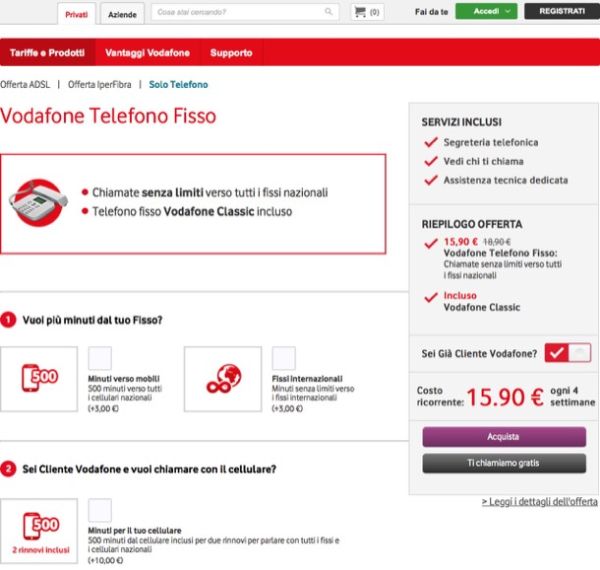 Anche Vodafone ha un'offerta dedicata esclusivamente alla linea voce. Si tratta di Telefono fisso che per 15,90 euro da pagare ogni 4 settimane offre telefonate gratuite verso i numeri fissi nazionali. Le chiamate verso i cellulari italiani e i fissi internazionali della Zona 1 costano invece 19 cent/min + 19 cent di addebito alla risposta. Nell'offerta è anche incluso il telefono Vodafone Classic.