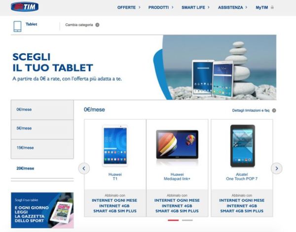 Internet ogni mese - consente di acquistare un tablet pagando rate da 0 a 20 euro/mese. La versione con 4GB di traffico Internet costa 10 euro/mese, quella con 10GB di traffico 20 euro/mese, mentre la versione del piano con 20GB di traffico costa 30 euro/mese. Maggiori info qui.