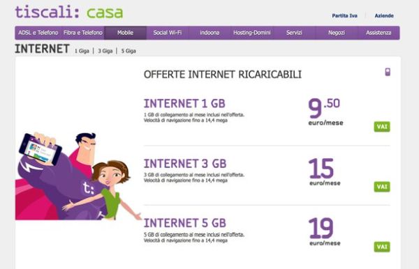 Tiscali non propone soluzioni per l'acquisto di tablet a rate, ma nel suo listino non mancano di certo le offerte interessanti per navigare in mobilità. Eccole: sono tutti piani ricaricabili con una velocità massima teorica di 14.4 Mbps e scatti anticipati di 15 minuti.
