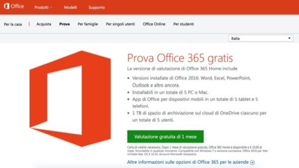 Per scaricare la trial gratuita di Office 365, collegati al sito Internet di Microsoft e clicca prima sul pulsante Prova gratis che si trova sotto la voce Office 365 Home e poi su Valutazione gratuita di 1 mese.
