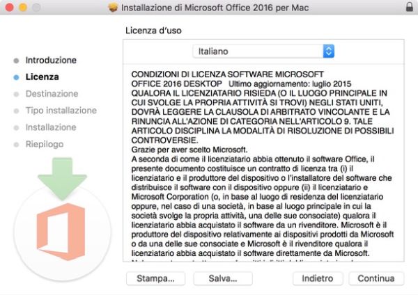 A download completato apri, facendo doppio click su di esso, il file Microsoft_Office_2016_Installer.pkg ed esegui il processo d'installazione di Office 2016 cliccando prima su Continua per due volte consecutive e poi su Accetta e Installa. Digita quindi la password del tuo account utente su macOS (quella che utilizzi normalmente per accedere al sistema) e concludi il setup pigiando prima su Installa software e poi su Chiudi.