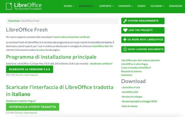 Per scaricare LibreOffice sul tuo Mac, collegati al sito Internet della suite e clicca sul pulsante Scaricate la versione xx. Dopodiché clicca sul pulsante Interfaccia utente tradotta e scarica sul tuo computer anche il language pack necessario a tradurre l'interfaccia del software in italiano (che di default è in inglese).