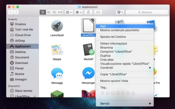 Ad operazione completata, fai click destro sull'icona di LibreOffice, seleziona la voce Apri dal menu che compare e clicca sul pulsante Apri nella finestra che si apre per avviare l'applicazione: questa procedura (che va seguita una sola volta) permette di bypassare il sistema Gatekeeper di macOS e di avviare LibreOffice nonostante non il software non sia stato firmato da uno sviluppatore certificato.