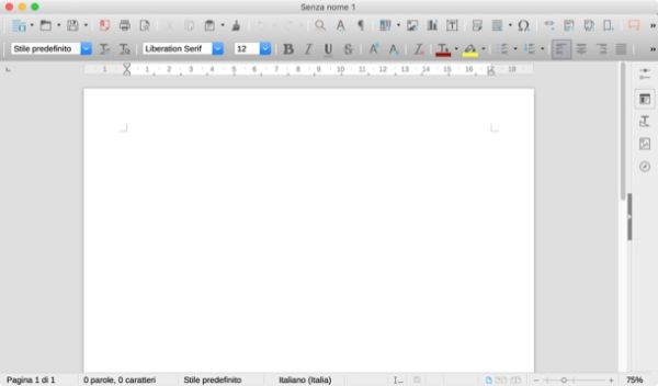 Perfetto! Ora puoi avviare LibreOffice tramite la sua icona presente nel Launchpad di macOS e scegliere il tipo di documento da creare usando le icone presenti nella barra laterale di sinistra: Documento Writer, Foglio Elettronico Calc, Presentazione Impress, Disegno Draw, Formula Math o Database Base.