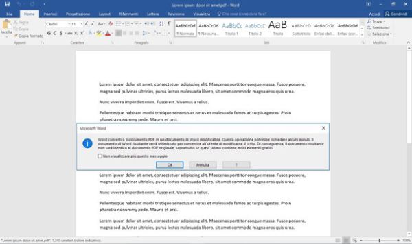 Per importare un file PDF in Word basta recarsi nel menu File > Apri del programma e selezionare il documento da modificare. Dopodiché bisogna cliccare sul pulsante OK (per accettare eventuali alterazioni del layout del file) ed applicare le modifiche desiderate al documento. Ad operazione completata, occorre quindi selezionare la voce Salva con nome dal menu File di Word e salvare il file come DOC o DOCX.