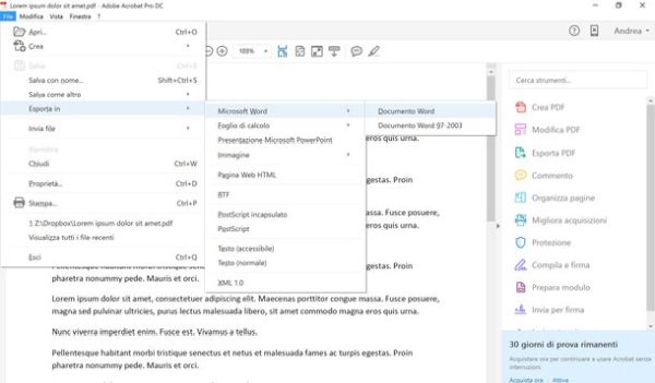 Al termine dell'installazione, per trasformare un PDF in DOC o DOCX, non devi far altro che avviare Acrobat, selezionare il documento da convertire (tramite il menu File > Apri del programma) e recarti nel menu File > Esporta in Microsoft Word > Documento Word (oppure Documento Word 97-2003 se vuoi ottenere un documento nel "vecchio" formato doc). Acrobat è dotato di tecnologia OCR, quindi è capace di trattare anche i PDF digitalizzati come immagini rendendone il testo modificabile.