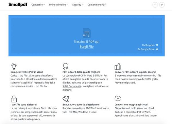 SmallPDF è uno dei migliori servizi online per la modifica e la conversione dei documenti PDF. Non richiede registrazioni, non presenta limiti di upload stringenti e tutela la privacy degli utenti cancellando tutti i file caricati sui suoi server a poche ore dall'upload. I suoi unici difetti sono la mancanza della tecnologia OCR (quindi non è in grado di convertire in testi modificabili i PDF digitalizzati come immagini) e l'impossibilità di convertire più file alla volta.