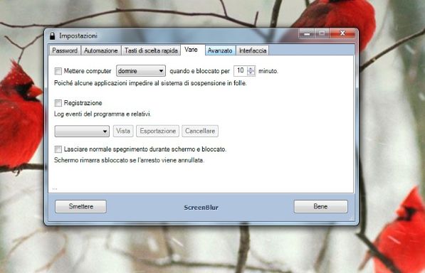 ScreenBlur è un programma gratuito per Windows XP, Vista, Windows 7 e Windows 8 che consente di bloccare il PC nei momenti di inutilizzo e renderne lo sblocco possibile solo mediante l'inserimento di una password. È molto semplice da usare e nasconde tutto ciò che si vede sullo schermo del computer: icone, taskbar, finestre e gadget. Supporta le scorciatoie da tastiera, disattiva i suoni del computer e consente di personalizzare la loco screen da mostrare quando il PC viene bloccato fin nei minimi dettagli. Scarica da qui.