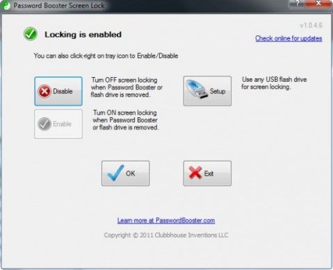 Password Booster Screen Lock è un'applicazione gratuita per Windows che consente di trasformare le chiavette USB in chiavi per bloccare e sbloccare il PC. Utilizzandola, si può fare in modo che il computer si blocchi automaticamente quando la chiavetta viene scollegata dalla porta USB e riprenda automaticamente la sessione di lavoro quando il dispositivo viene collegato alla macchina. È molto facile da utilizzare ed è ampiamente personalizzabile. Una volta configurato è anche possibile attivare/disattivare momentaneamente il blocco del PC tramite l'utilizzo della penna USB trasformata in "chiave magica". Scarica da qui.
