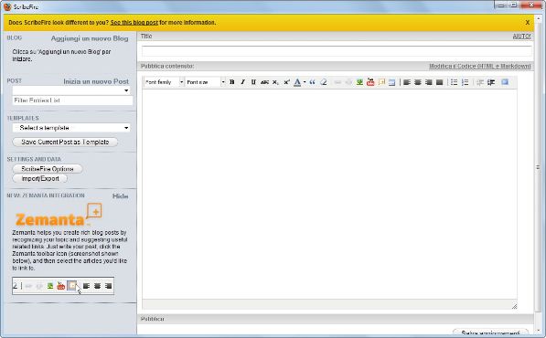 ScribeFire non è un programma per blog stand-alone ma una estensione per Mozilla Firefox, Google Chrome, Opera e Safari che permette di scrivere e gestire facilmente sui blog ospitate da tutte le principali piattaforme di blogging. Supporta la gestione di tag, categorie, bozze e permette di operare sia con un editor visuale che con un editor HTML. È molto semplice da usare e consente di inserire facilmente nei propri post qualsiasi tipo di elemento multimediale, come immagini o video di YouTube. Scarica da qui.