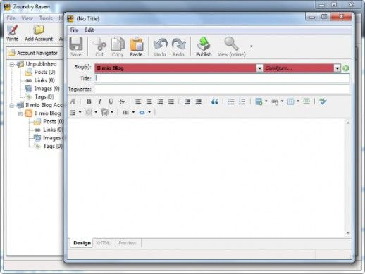 Zoundry Raven è un blog editor WYSIWYG/XHTML di ultima generazione che permette di rendere più semplice e rapida la pubblicazione di post su tutte le principali piattaforme di blogging. È comodo come un qualsiasi programma di word processing consente di gestire agevolmente tag, foto, file musicali, video e molto altro ancora. Supporta la gestione contemporanea di più blog e più servizi di hosting e lavora perfettamente in modalità offline. È disponibile gratuitamente ed è compatibile con tutte le principali versioni di Windows. Scarica da qui.