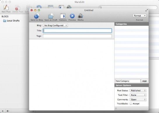 MarsEdit è a giudizio di molti il miglior programma di blogging per Mac OS X. Permette di scrivere post sia in modalità visuale (WYSIWYG) sia in modalità codice (HTML) su tutte le principali piattaforme di blogging (WordPress, Blogger, Tumblr, TypePad, Squarespace 5, Movable Type, ecc.) e si integra perfettamente con programmi come iPhoto e Lightroom. consentendo l'inserimento di foto presenti in questi ultimi nei post. Consente di lavorare comodamente anche in modalità offline e di gestire in maniera semplificata i file da caricare sul blog. Il software è a pagamento ma è disponibile in una versione di prova gratuita che permette di testarne tutte le funzioni per un periodo di 30 giorni. Scarica da qui.