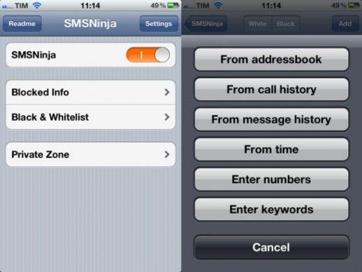 SMSNinja è un'applicazione gratuita disponibile solo per gli iPhone jailbreakkati che permette di bloccare chiamate ed SMS provenienti da mittenti indesiderati. Utilizzandola, è possibile creare una lista nera di numeri di telefono in relazione alla quale iPhone blocca telefonate e messaggi in maniera completamente automatica. I numeri da bloccare si possono digitare in maniera libera oppure attingere in maniera molto più semplice dalla rubrica dello smartphone o dal registro delle chiamate ricevute. Anche se è disponibile solo in lingua inglese, la app risulta facilmente utilizzabile anche dagli utenti meno esperti. Scaricabile solo tramite Cydia.