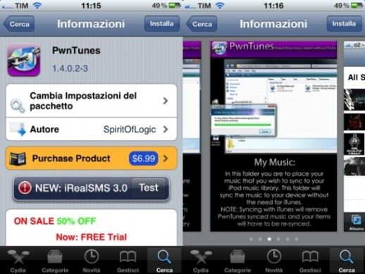 PwnTunes è un'applicazione per iPhone sbloccati che permette di copiare la musica sullo smartphone di Apple come se fosse una qualsiasi chiavetta USB. Una volta installata, consente di copiare qualsiasi brano musicale su iPhone collegando il dispositivo al PC, accedendo ad esso tramite le risorse del computer e copiando le canzoni nella cartella “My Music”. Il software è a pagamento (costa 9,99 euro) ma è disponibile in una versione di prova gratuita che permette di testarne tutte le funzioni per un periodo di tempo limitato. Scaricabile solo tramite Cydia.