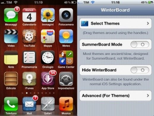 WinterBoard è un'applicazione gratuita che permette di applicare temi personalizzati sugli iPhone soggetti a jailbreak. Dopo averla installata, è possibile recarsi nella sezione “Themes” di Cydia e scaricare tanti temi grafici che cambiano in un sol colpo lo sfondo e le icone della home screen di iPhone. La app permette inoltre di applicare delle modifiche singole all'interfaccia utente di iOS cambiando il livello di trasparenza della barra dock, i colori delle barre di navigazione, alterando l'aspetto delle icone e della barra di stato di iPhone. Tutte le modifiche si possono applicare con un semplice tap e possono essere disattivate in maniera altrettanto semplice senza rischi di sorta per la stabilità del melafonino. Scaricabile solo tramite Cydia.