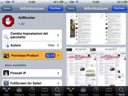 A volte, le pubblicità online possono rendere la navigazione da smartphone particolarmente difficoltosa, e qui entra in gioco AdBlocker per iPhone. AdBlocker è una app funzionante esclusivamente sui dispositivi sottoposti a jailbreak che permette di bloccare le pubblicità su Safari Mobile ed altri browser per iPhone grazie ad una serie di filtri automatici che impediscono il caricamento dei testi pubblicitari e dei banner più diffusi sul Web. Il software è disponibile solo a pagamento e costa 2,19 dollari. Scaricabile solo tramite Cydia.