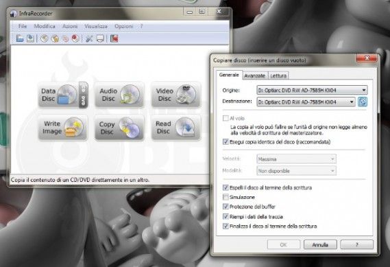 InfraRecorder è un software di masterizzazione gratuito ricco di funzioni che permette di soddisfare gran parte delle esigenze legate alla masterizzazione di CD e DVD senza ricorrere a costose soluzioni professionali. Attraverso la sua interfaccia utente semplice e curata (tradotta in italiano), il programma permette di creare CD/DVD di dati, CD musicali, DVD video, masterizzare file immagine, creare file immagine e duplicare CD. La copia dei CD può essere effettuata in maniera standard, trasferendo il contenuto del disco di origine sull'hard disk del computer e poi riservando il tutto su un supporto vuoto, oppure “al volo”, cioè copiando direttamente i dati da un CD all'altro. Scarica da qui.