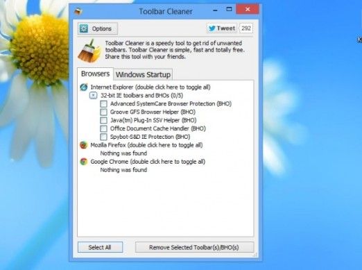 Toolbar Cleaner è uno dei migliori programmi per eliminare toolbar disponibili gratuitamente su Windows. Con pochi e semplici click, permette di rilevare e rimuovere tutte le principali toolbar aggiuntive presenti in Internet Explorer, Mozilla Firefox e Google Chrome. Analizza inoltre gli elementi impostati per l'avvio automatico sul PC e il suo database viene aggiornato di continuo, questo consente all'applicazione di riconoscere e rimuovere centinaia di toolbar promozionali (o malevole) in qualsiasi browser Web. Scarica da qui.
