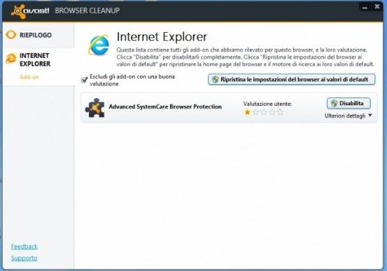 Prodotto dalla stessa azienda dell'omonimo antivirus gratuito, Avast Browser Cleanup è un software gratuito che si occupa di scansionare il sistema e rilevare tutti i componenti aggiuntivi superflui installati nei browser Web. Supporta Internet Explorer, Firefox e Chrome rimuovendo in un sol colpo tutte le principali toolbar promozionali e gli addon malevoli. Per utilizzarlo, basta avviarlo (non richiede installazioni), selezionare i componenti aggiuntivi da rimuovere in Internet Explorer, Firefox e Chrome e cliccare sul pulsante di eliminazione. Scarica da qui.
