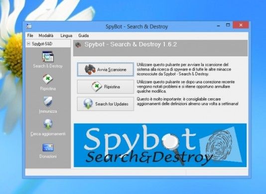 SpyBot è uno dei software antispyware gratuiti più utilizzati in ambiente Windows. Utilizzandolo, è possibile scansionare il sistema e liberarlo da numerosissimi tipi di spyware e toolbar promozionali per il browser. Offre inoltre una funzione di immunizzazione del browser che consente di bloccare sul nascere i siti malevoli evitando così l'installazione di software malevoli sul PC. Il suo database con le definizioni antispyware viene aggiornato spesso garantendo sempre il massimo livello di protezione. È disponibile in tre versioni, di cui due a pagamento con funzionalità aggiuntive. Scarica da qui.