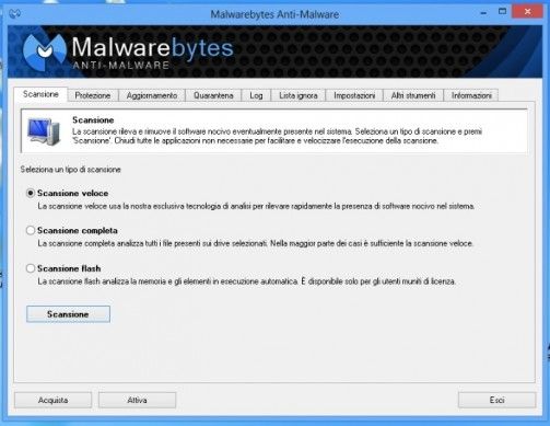 Malwarebytes Anti-Malware è uno dei migliori programmi antimalware disponibili gratuitamente per Windows. Grazie ad esso, è possibile scansionare in maniera rapida o approfondita il sistema rilevando (e successivamente eliminando) tutti i software malevoli trovati al suo interno (comprese alcune toolbar per i browser). Non avendo moduli per il controllo in tempo reale del sistema, non si "pesta i piedi" con i software antivirus e non rallenta in alcun modo il PC. Il suo database con le definizioni antimalware viene aggiornato molto spesso garantendo sempre il massimo livello di efficienza. È disponibile anche in una versione a pagamento con maggiori funzionalità. Scarica da qui.