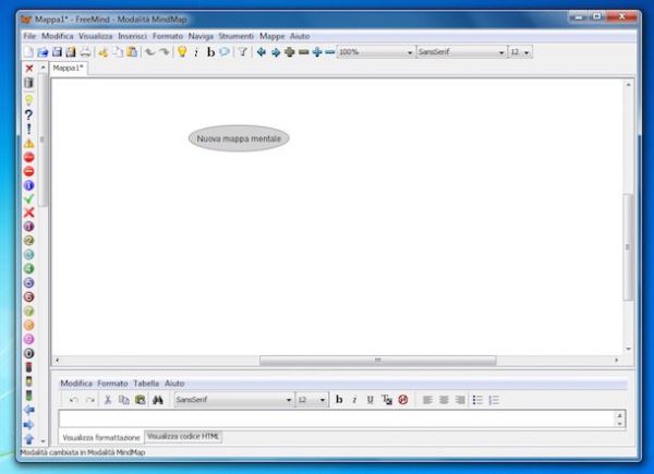 Per creare una mappa concettuale con FreeMind avvia il programma, clicca sulla voce Nuova mappa mentale collocata al centro della finestra del programma per modificare il nodo radice e cliccare poi con il tasto destro del mouse per visualizzare le ulteriori opzioni disponibili per ampliare la mappa concettuale. Puoi anche modificare i vari nodi della mappa concettuale ed aggiungere elementi extra mediante gli appositi strumenti accessibili dalla barra di sinistra e quella posta in alto.