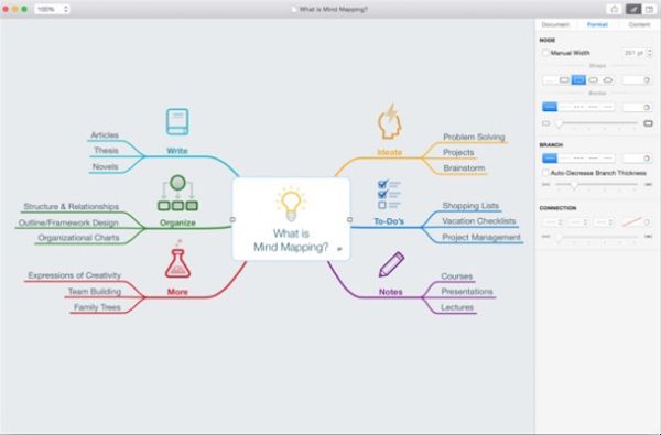 In ambiente Mac, MindNode è una delle applicazioni più usate in assoluto per la creazione di mappe concettuali e mentali. Dispone di un'interfaccia utente molto intuitiva e tra le sue caratteristiche più interessanti c'è la possibilità di sincronizzare le mappe con i dispositivi iOS, iPhone e iPad, dove possono essere sia visualizzate che modificate.