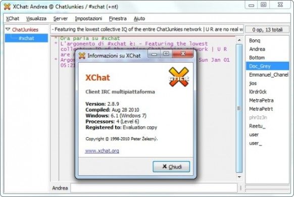 XChat è un client IRC open source per Linux e Windows che permette di connettersi, chattare e scaricare file da più canali e server IRC contemporaneamente. Ha un'interfaccia utente piuttosto basilare, come quella di mIRC, e supporta varie funzioni avanzate, come il salvataggio delle sessioni di chat. Il software è a pagamento ma è disponibile in una versione di prova gratuita che permette di testarne tutte le funzioni per un periodo di 30 giorni. Scarica da qui.