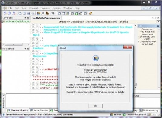 HydraIRC è un'alternativa gratuita ed open source a mIRC che permette di chattare su canali e server IRC di tutto il mondo. Supporta le chat e il trasferimento dei file DCC, la connessione a più server contemporaneamente, la navigazione a schede, i plugin DLL , il monitoraggio dei canali e molto altro ancora. Dispone di un'interfaccia utente molto chiara e semplice da usare intercambiabile grazie a delle skin. Non è stato ancora tradotto in italiano ma è estremamente semplice da utilizzare, per certi versi anche più di mIRC. Scarica da qui.