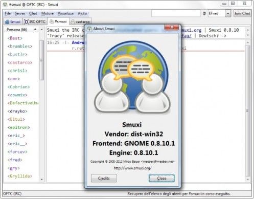 Smuxi è un client IRC universale per Windows, Mac OS X e Linux basato su GNOME / GTK+ che permette di chattare su tutti i server e canali IRC (in maniera pubblica e privata) e di scaricare file dalla rete IRC. È caratterizzato da un'interfaccia molto essenziale e dispone di varie funzionalità avanzate, come il controllo ortografico, la visualizzazione a schermo intero e la gestione avanzata dei comandi, che ne rendono l'uso particolarmente confortevole agli utenti più esperti. È tradotto completamente in italiano e viene aggiornato molto spesso. Scarica da qui.