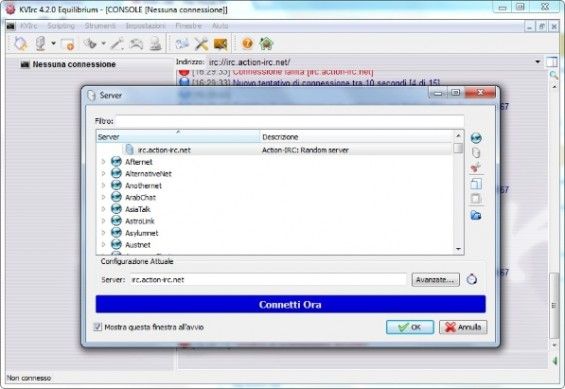 KVIrc è un client IRC aperto, libero e portabile (che non necessita di installazioni per poter funzionare) basato su Qt GUI toolkit. KVIrc. Il suo sviluppo viene seguito da una community di developer molto attiva, tutti appassionati di IRC. Include un'interfaccia molto semplice da utilizzare (tradotta completamente in italiano) ed è caratterizzato da una struttura modulare che permette di caricare gli elementi non usati più frequentemente solo quando necessario. È disponibile per tutti i principali sistemi operativi per computer: Windows, Mac OS X, Linux ed altri. Scarica da qui.