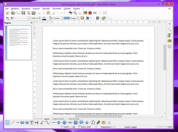 Ad installazione completata, puoi aprire un documento PDF con LibreOffice Draw (l'applicazione della suite dedicata alla creazione di documenti stampabili) e modificarlo usando le icone collocate nella parte bassa dello schermo: le forme geometriche e le frecce per inserire indicazioni ed elementi cerchiati nel documento, la lettera “T” per aggiungere campi di testo personalizzati, e così via. Per modificare il testo del PDF, invece, basta semplicemente selezionarlo con il mouse.