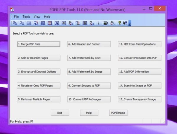 Se non hai bisogno di lavorare sul testo dei documenti, ti consiglio vivamente di dare un'occhiata a PDFill FREE PDF Tools che è uno dei migliori programmi per modificare PDF disponibili in ambito gratuito su Windows. Permette di unire e dividere i PDF, convertirli in immagini, cifrarli e decifrarli (tramite la rimozione della owner password), ruotarne o riordinarne le pagine e applicare loro dei watermark.