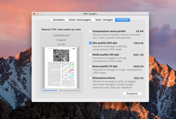 Se utilizzi un Mac, come alternativa al opracitato PDFill FREE PDF Tools puoi usare PDF Toolkit+ che trovi sul Mac App Store al costo di 1,99 euro. L'applicazione, che è completamente in italiano ed estremamente facile da usare, permette di unire e dividere i documenti PDF, estrarre le pagine e le immagini da questi ultimi, convertire i PDF in foto JPG o PNG, ridurne le dimensioni e molto altro ancora.