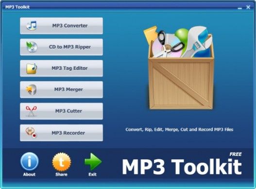 Come suggerisce il nome, MP3 Toolkit è una raccolta di strumenti gratuiti dedicati ai file MP3. Grazie a questo programma estremamente semplice da usare, è possibile convertire MP3 da e verso formati di file WMA, WAV, OGG ed AAC, estrarre l'audio dai video, rippare CD musicali in file mp3, modificare i tag dei file mp3, tagliare/unire brani musicali in formato mp3 e realizzare registrazioni audio da salvare in formato MP3. Permette anche di operare su più file contemporaneamente (modalità batch). Scarica da qui.
