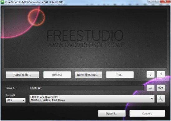 Un altro programma il cui nome ne rivela tutte le principali funzioni. Free Video to MP3 Converter è un software gratuito per Windows che permette di estrarre l'audio dai file video e convertirlo in formato mp3 dando all'utente la possibilità di configurare fin nei minimi dettagli le caratteristiche del file di output. È molto facile da usare ed è molto veloce nelle conversioni. Tra i formati di file supportati ci sono: avi, mp4, wmv, webm, rm, 3gp, mov, mpg e molti altri ancora. Scarica da qui.