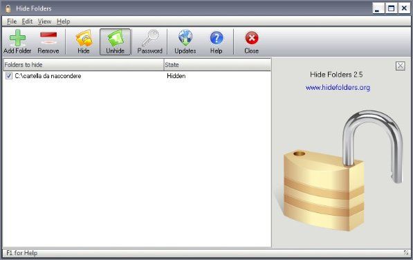 Hide Folders è uno dei programmi per nascondere cartelle più efficaci e semplici da usare disponibili per Windows. Utilizzarlo è semplicissimo: una volta installato, basta selezionare le cartelle da rendere invisibili ed applicare una password di protezione al programma per evitare modifiche non autorizzate delle sue impostazioni. Le cartelle nascoste con questo software non possono essere scoperte né attivando la visualizzazione dei file nascosti su Windows né cancellando il programma dal computer. Funziona con tutte le versioni di Windows e i file system (FAT32, NTFS e FAT.). Scarica da qui.