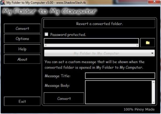 My Folder to My Computer è un programma per nascondere cartelle molto originale che permette di camuffare le proprie cartelle in elementi di sistema. Questo significa che è possibile prendere qualsiasi cartella del PC e trasformarla in un finto collegamento a Risorse del computer, il quale per sua natura non dà nell'occhio, ma la protezione non finisce qui. Oltre al camuffamento, My Folder to My Computer provvede anche a bloccare gli accessi non autorizzati alle cartelle provate assegnando loro una password senza l'inserimento della quale non si possono aprire. Scarica da qui.