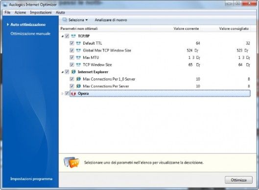 Auslogics Internet Optimizer è uno dei migliori programmi per ottimizzare la connessione Internet. Analizza automaticamente la configurazione del sistema ed ottimizza tutti i parametri relativi alla connessione Internet velocizzandola al massimo. È estremamente facile da usare, anche perché funziona in maniera totalmente automatica ed è tradotto in italiano. Ora fa parte della suite a pagamento per l'ottimizzazione del computer Auslogics BosstSpeed ma è ancora possibile scaricarlo come software stand-alone da siti di terze parti. Scarica da qui.