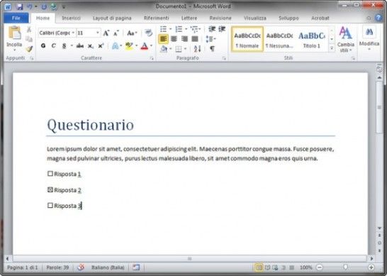 Perché perdere tempo ad installare ed apprendere il funzionamento di nuovi software quando si possono creare questionari di ottimo livello anche con Word? Forse non tutti lo sanno, ma il celeberrimo programma di videoscrittura incluso nel pacchetto Office di Microsoft offre una serie di strumenti che permettono di creare questionari compilabili in maniera estremamente facile e veloce. Certo, il programma non è gratuito ma ormai chi è che non lo ha installato sul proprio PC Windows? Microsoft Word è compreso nella suite Microsoft Office 2010 che è disponibile in una versione di prova gratuita della durata di 60 giorni prelevabile direttamente dal sito Internet di Microsoft. Scarica da qui.