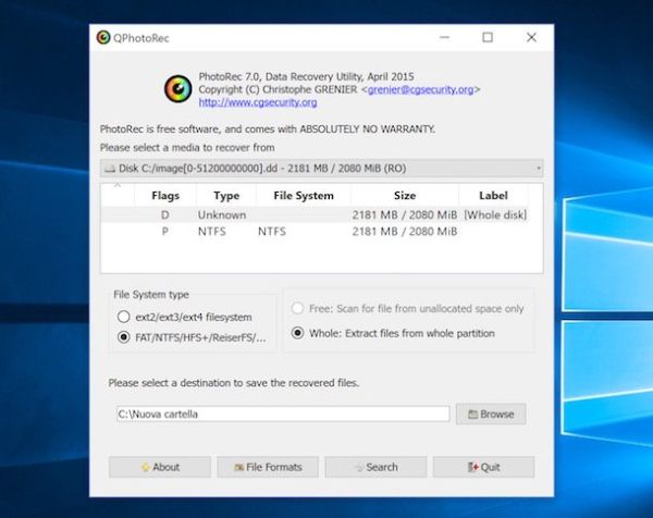A questo punto, metti il segno di spunta accanto alla voce Whole, fai click sul pulsante File Formats per selezionare le tipologie di file da recuperare e pigia su Search per avviare il recupero dei dati. Tutti i file trovati da PhotoRec verranno salvati automaticamente nella cartella che hai indicato cliccando sul pulsante "Browse".
