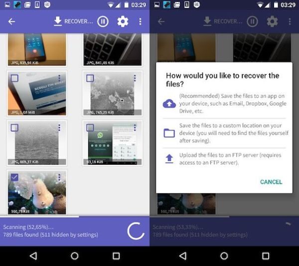 A scansione ultimata, seleziona i file da recuperare, pigia sul pulsante Recover che si trova in alto e scegli se esportare gli elementi su un servizio di cloud storage, se auto-inviarteli via email o se archiviarli sulla memoria dello smartphone/tablet (scelta sconsigliata). Se ti servono maggiori info sul funzionamento di DiskDigger, consulta la mia guida su come recuperare file cancellati da Android in cui ti ho parlato in maniera più approfondita della app.