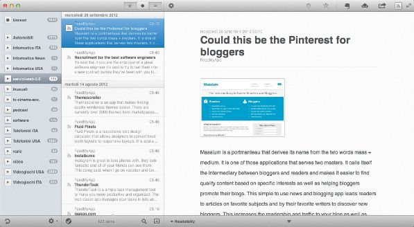 Reeder è uno dei migliori client per feed RSS disponibili per Mac OS X, iPhone ed iPad. Caratterizzato da un'interfaccia molto curata ed elegante, questa applicazione dispone di tutte le funzioni più avanzate per consultare le proprie notizie preferite e condividerle su vari social network e servizi online. Si sincronizza rapidamente con Google Reader e viene aggiornato molto spesso. La versione per Mac OS X ed iPad costa 3,99 euro mentre quella per iPhone è disponibile a 2,39 euro. Scarica da qui.