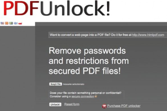 PDFUnlock! è una delle più popolari Web application per la rimozione delle protezioni dai file PDF. Come molte altre soluzioni simili - sia Desktop che online - non consente di rimuovere la user-password richiesta per l'apertura dei documenti ma solo le protezioni contro la stampa e la modifica dei PDF. Per utilizzarlo, basta collegarsi alla sua pagina principale, cliccare sul pulsante Sfoglia/Scegli file, selezionare il documento da sbloccare e scaricare il risultato finale, ossia il PDF originale senza le restrizioni riguardanti modifica e stampa. Funziona con tutti i browser senza necessitare di software aggiuntivi. Scarica da qui.