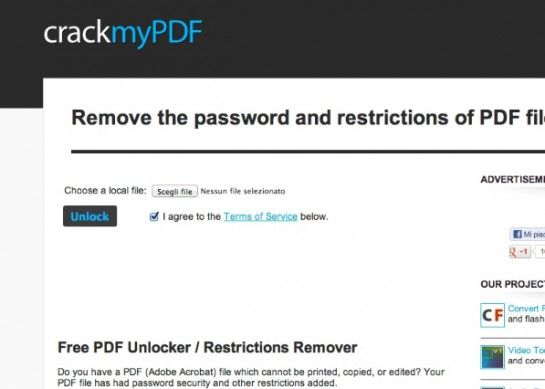 CrackMyPDF è un altro servizio online per sbloccare PDF molto efficace e rapido che consente di rimuovere le protezioni contro la stamp a e la modifica dai documenti in formato PDF. Non suppota la rimozione dei DRM o delle password utente che vengono richieste per la visualizzazione dei file. Per utilizzarlo, basta collegarsi alla sua pagina principale, cliccare sul pulsante Sfoglia/Scegli file e selezionare il PDF da sbloccare. L'intera procedura viene eseguita in pochissimi secondi e senza necessitare di alcun tipo di software aggiuntivo. Scarica da qui.