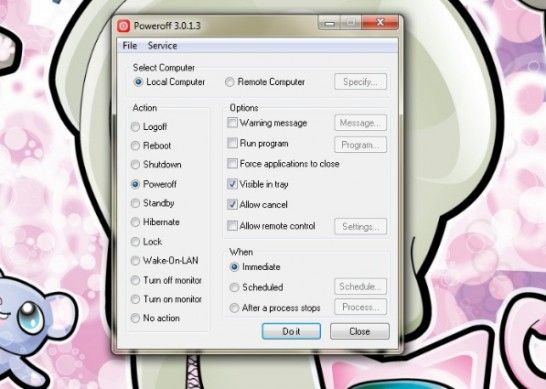 Come suggerisce abbastanza facilmente il nome, PowerOff è un software gratuito che permette di impostare lo spegnimento, il riavvio o lo standby del PC in base ad una programmazione. Per usarlo, basta lanciare l'applicazione, mettere il segno di spunta accanto all'operazione da programmare (spegnimento, riavvio, standby, ibernazione, ecc.) e infine impostare l'orario di esecuzione dell'operazione. Supporta anche lo spegnimento automatico del monitor e funziona su computer in remoto. Si tratta di un software portable, il che significa che non richiede installazioni per poter funzionare e può essere eseguito da qualsiasi chiavetta USB. Scarica da qui.
